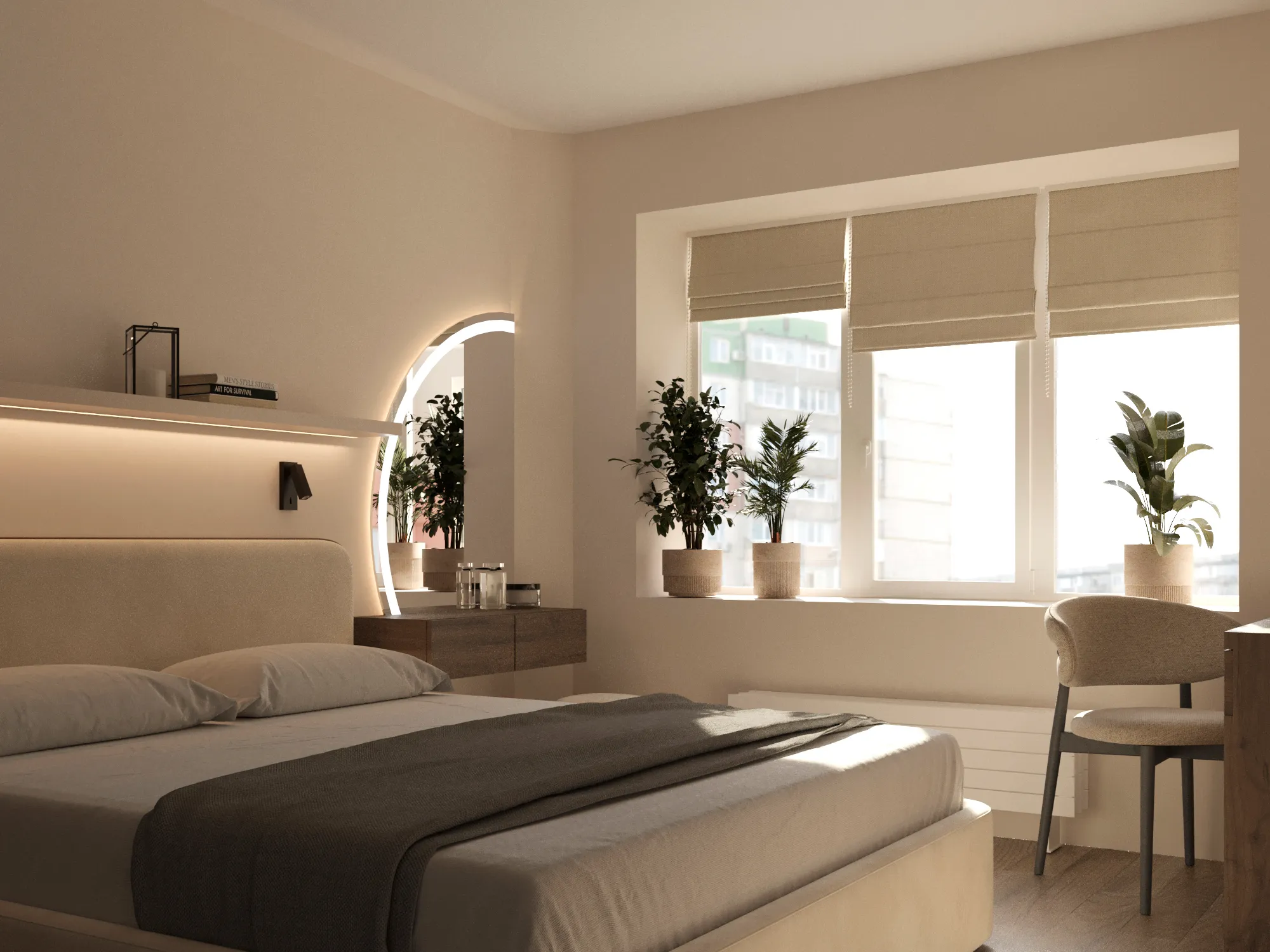 Як результат, ми створили інтер’єр, який повністю відповідає цінностям і підходу до життя. Світлі сіро-бежеві тони, м’які текстури з нотками стриманості, комфортне робоче місце, великий і функціональний гардероб, який приховує все зайве… У такій кімнаті легко підтримувати порядок і чистоту.