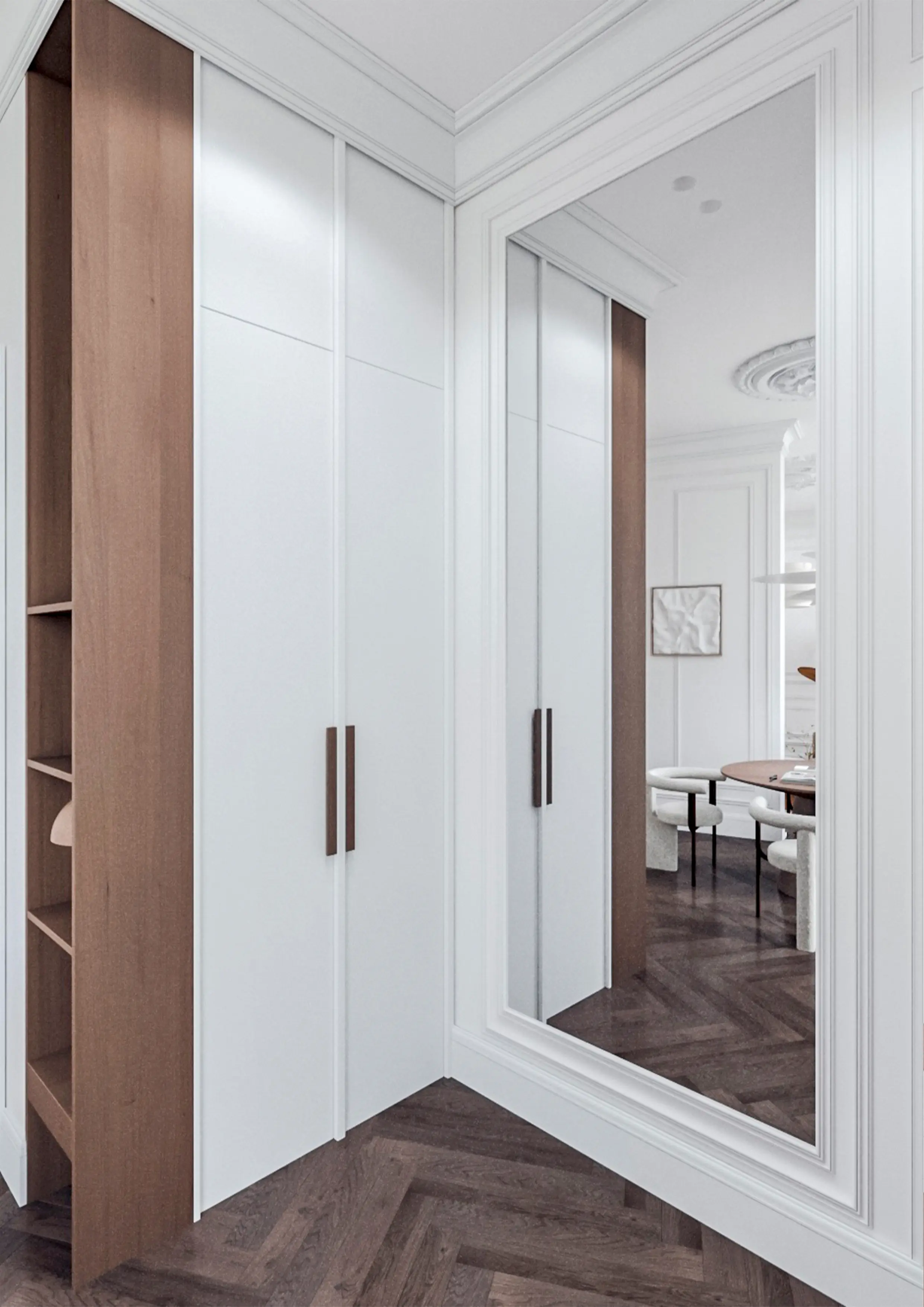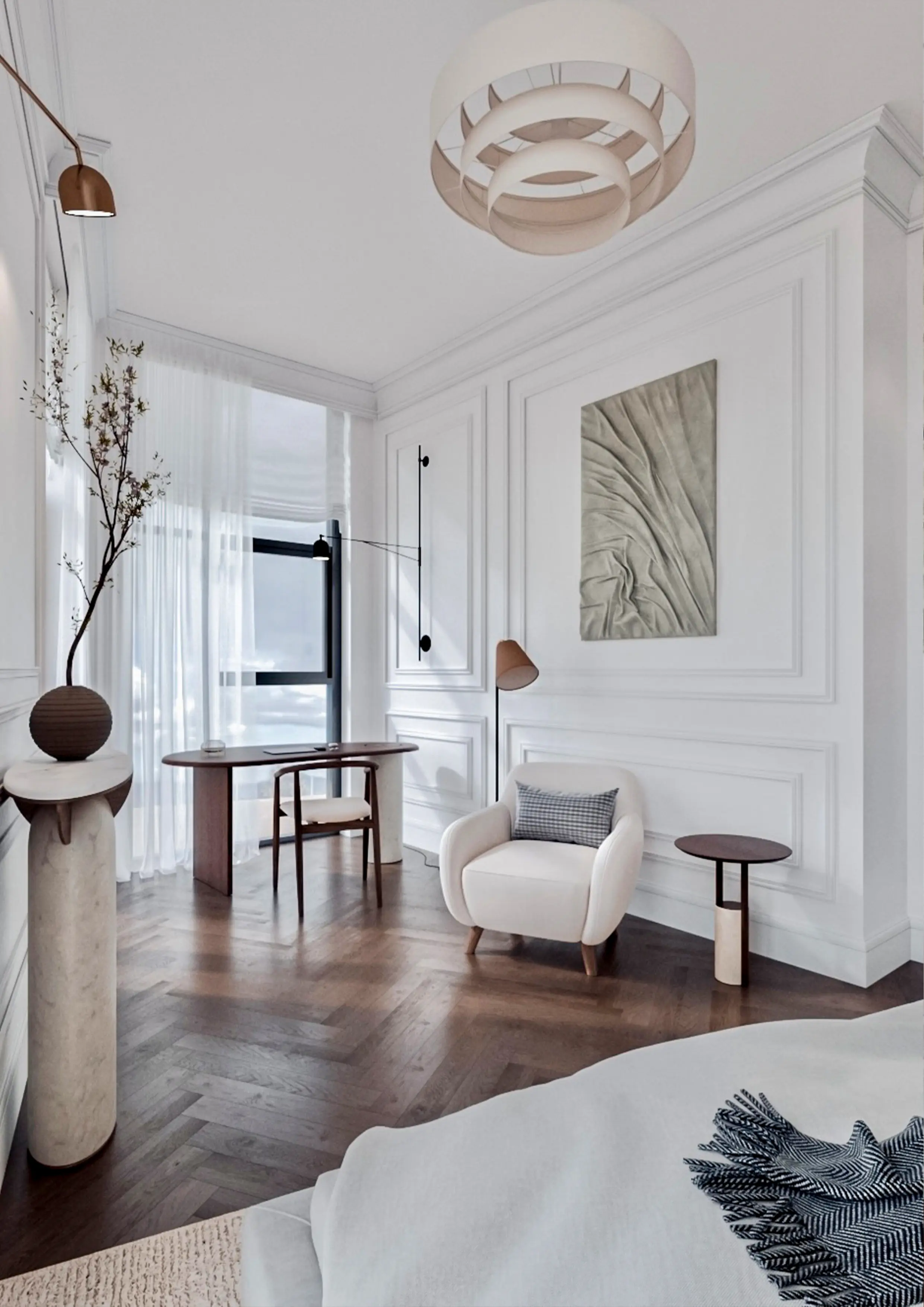 У цьому інтер’єрі сміливо поєднуються класика і сучасність, стриманість і чуттєвість. Білий колір створює відчуття простору, легкості та свободи. Глибокі відтінки коричневого та сірого підкреслюють стабільність, впевненість і зрілість. Це простір жінки, яка ухвалює рішення, тримає фокус і досягає високих результатів.